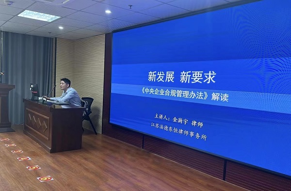 為加強(qiáng)企業(yè)合規(guī)管理,落實(shí)風(fēng)險(xiǎn)排查制度,6月2日下午,集團(tuán)邀請(qǐng)江蘇法德東恒律師事務(wù)所金澍宇律師為全體員工開(kāi)展《中央企業(yè)合規(guī)管理辦法》專題培訓(xùn)。