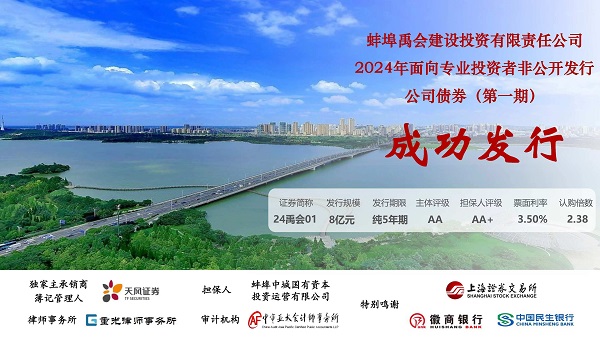 2024年11月7日,蚌埠禹投集團(tuán)有限公司所屬子公司蚌埠禹會建設(shè)投資有限責(zé)任公司面向?qū)I(yè)投資者成功發(fā)行8億元非公開公司債券(第一期)。本次債券由天風(fēng)證券股份有限公司負(fù)責(zé)承銷,蚌埠中城國有資本投資運(yùn)營有限公司提供擔(dān)保,發(fā)行期限5年,利率3.5%。