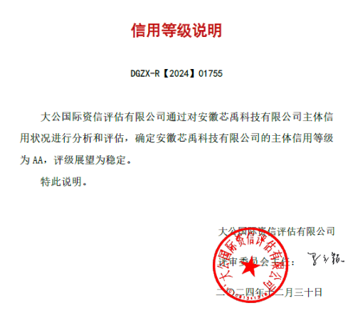 2024年12月30日,安徽芯禹科技有限公司(以下簡稱“安徽芯禹公司”)獲取“大公國際資信評(píng)估有限公司”主體信用AA評(píng)定,評(píng)級(jí)展望為穩(wěn)定。