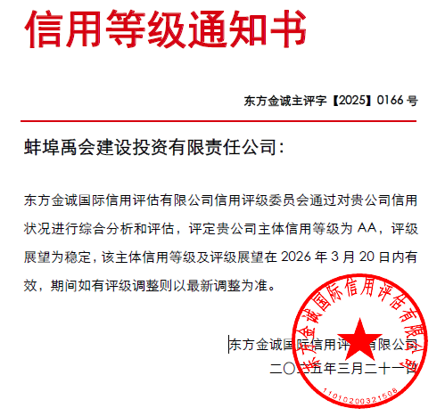 2025年3月21日,蚌埠禹會(huì)建設(shè)投資有限責(zé)任公司(以下簡(jiǎn)稱“蚌埠禹會(huì)建投公司”)再次獲取“東方金誠(chéng)國(guó)際信用評(píng)估有限公司”主體信用AA評(píng)定,評(píng)級(jí)展望為穩(wěn)定。